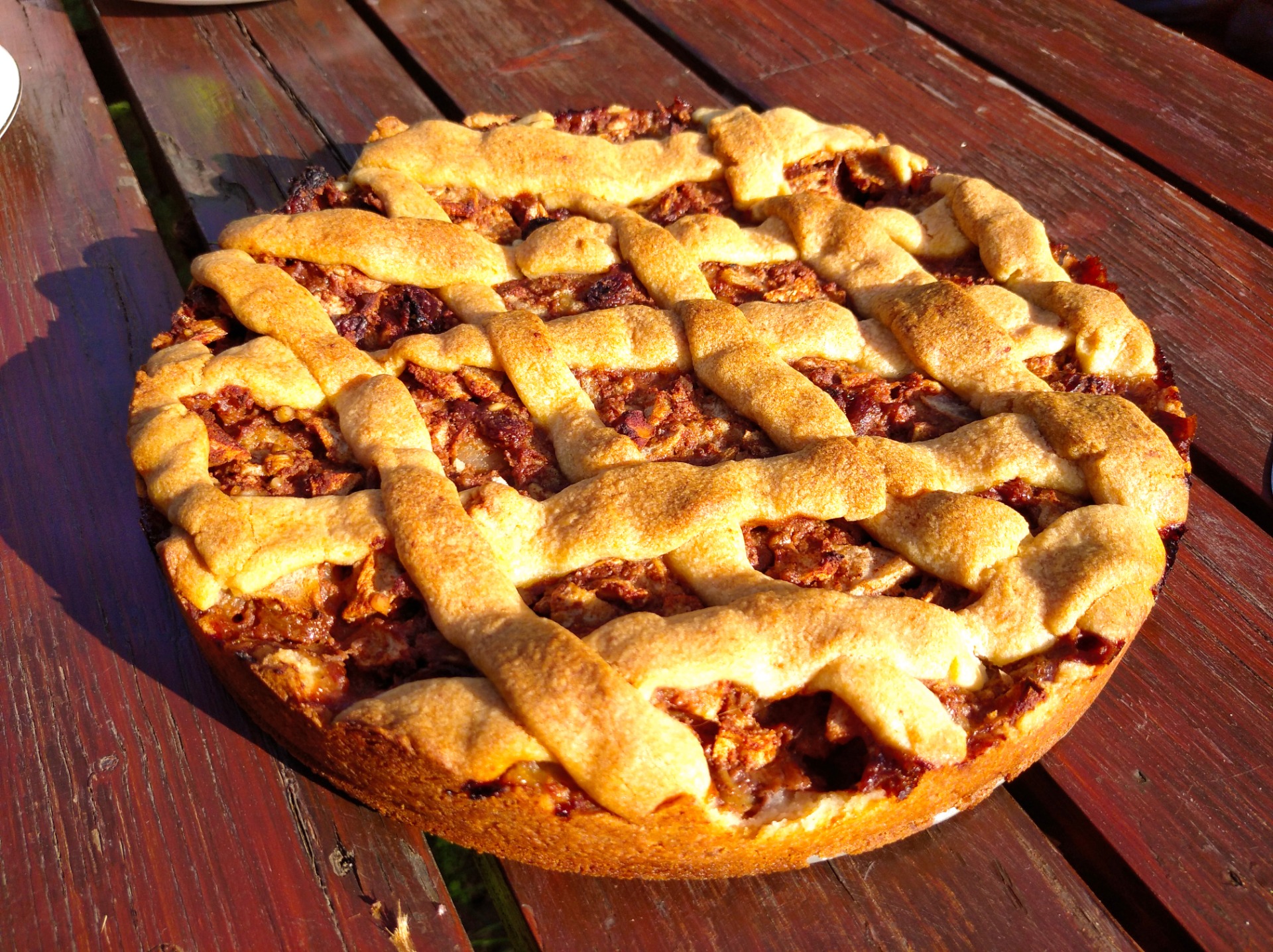 2/3 cesta vyvaľkáme do tenkej vrstvy (kruh cca 3 cm) a vložíme do okrúhlej pečúcej formy vyloženej papierom na pečenie. Cesto posypeme strúhankou a potom do formy na cesto dáme jablkovú zmes. Zostávajúcu 1/3 cesta vyvaľkáme do tenka , rozkrájame ho na 1 cm široké pruhy, ktoré cez seba rozprestrieme na koláč tak, aby tvorili mriežku. Konce pruhov pevne zatlačíme do okraja koláča.